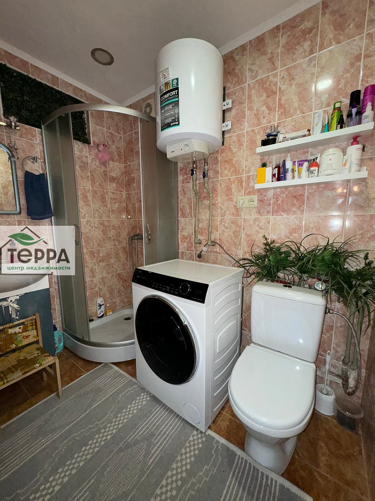 Кухня оборудована удобной вытяжкой и электрической духовкой. В ванной комнате установлена стиральная машина, а бойлер гарантирует постоянное наличие горячей воды.