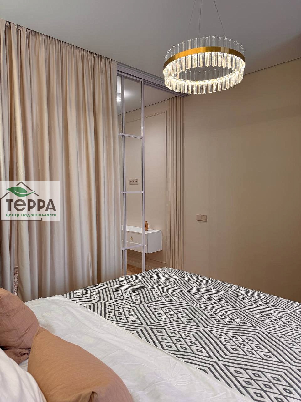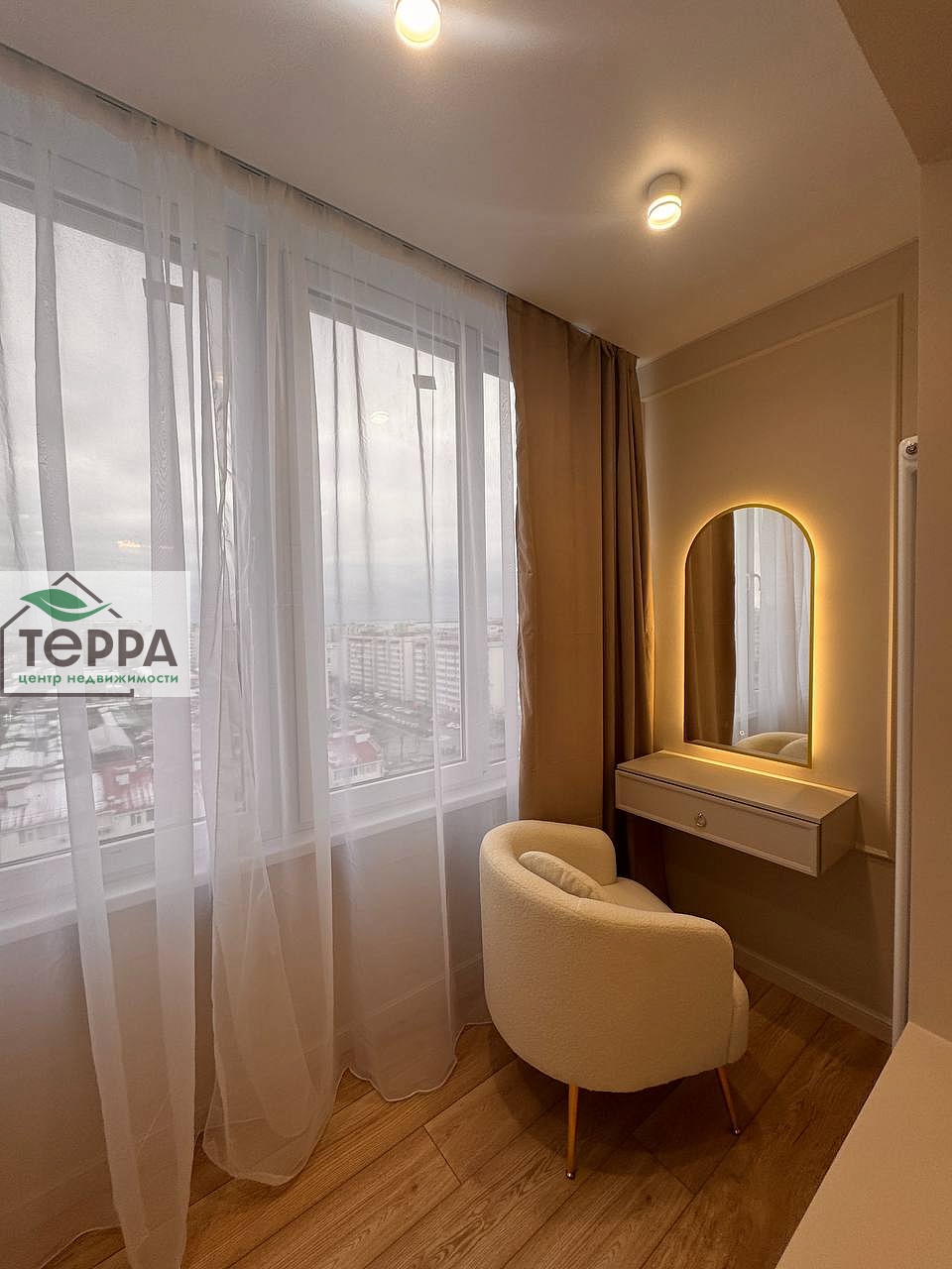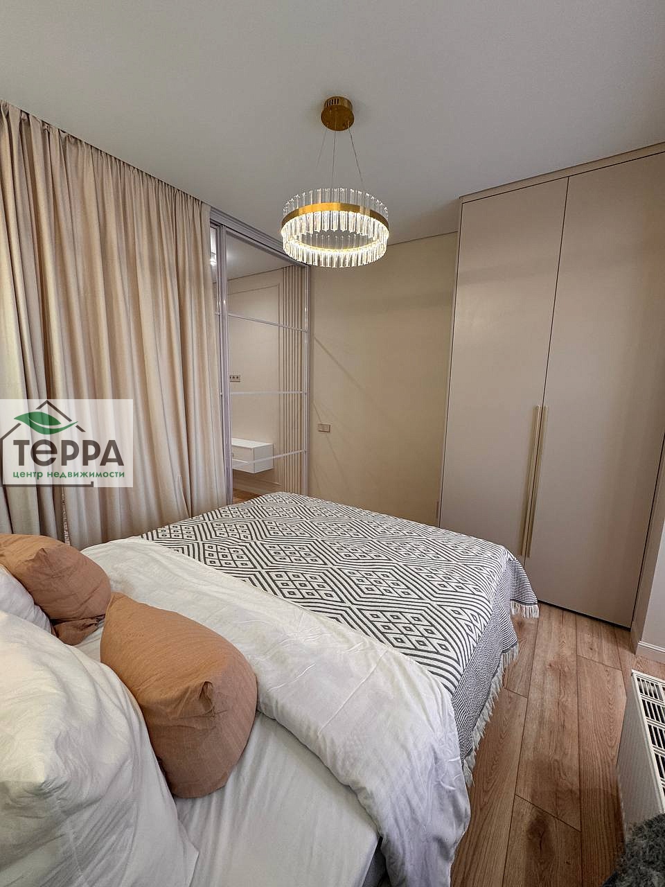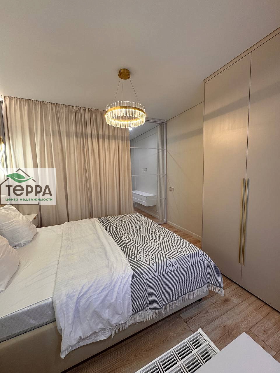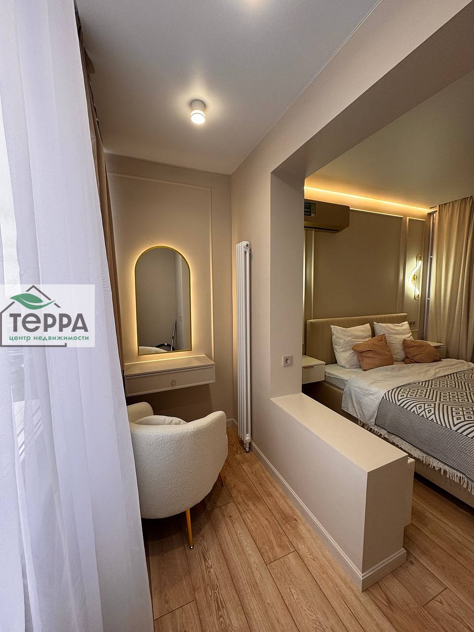 В спальне полноценная двуспальная кровать с подъемным механизмом, что обеспечивает дополнительное место хранения, так же встроенный шкаф, выполненный на заказ. Косметический столик с зеркалом и уютным креслом.