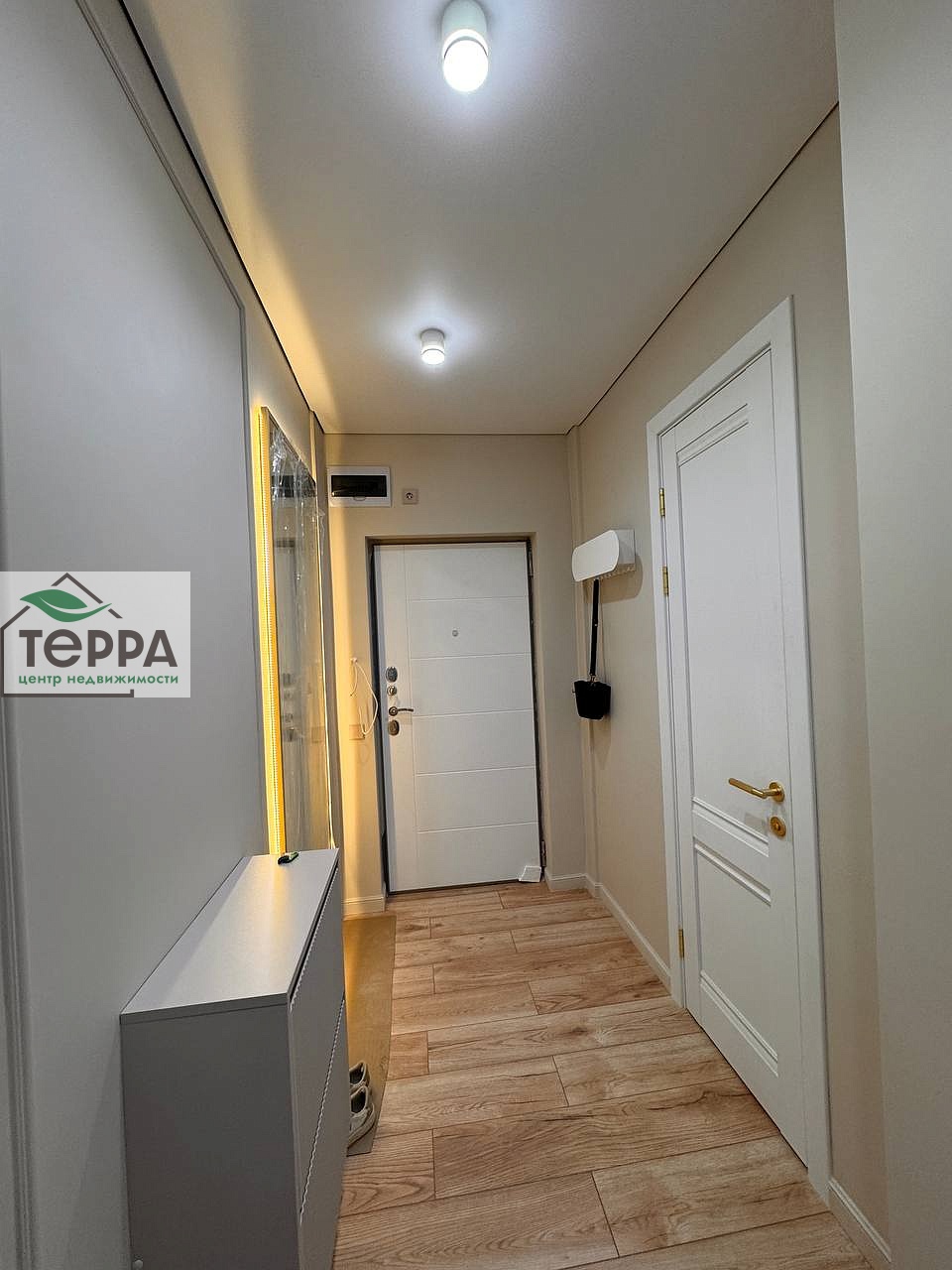 Прихожая так же оборудована всем необходимым: большое зеркало с подсветкой, обувница, вешалка для верхней одежды.
