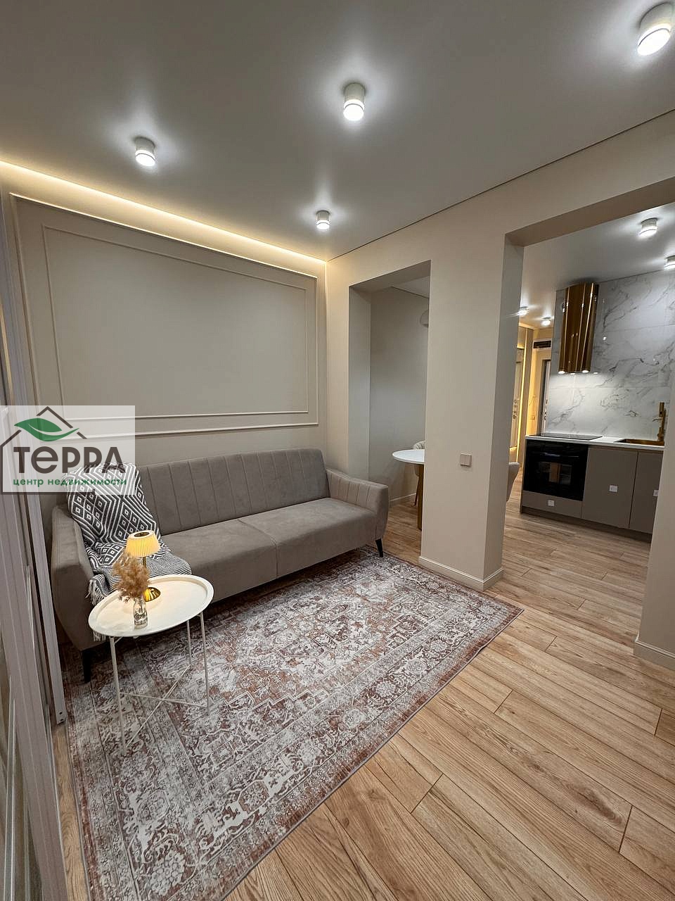 По всему периметру квартиры уложен премиальный ламинат, натяжной парящий потолок с подсветкой. Высота потолка 270. Предусмотрены разные сценарии света.