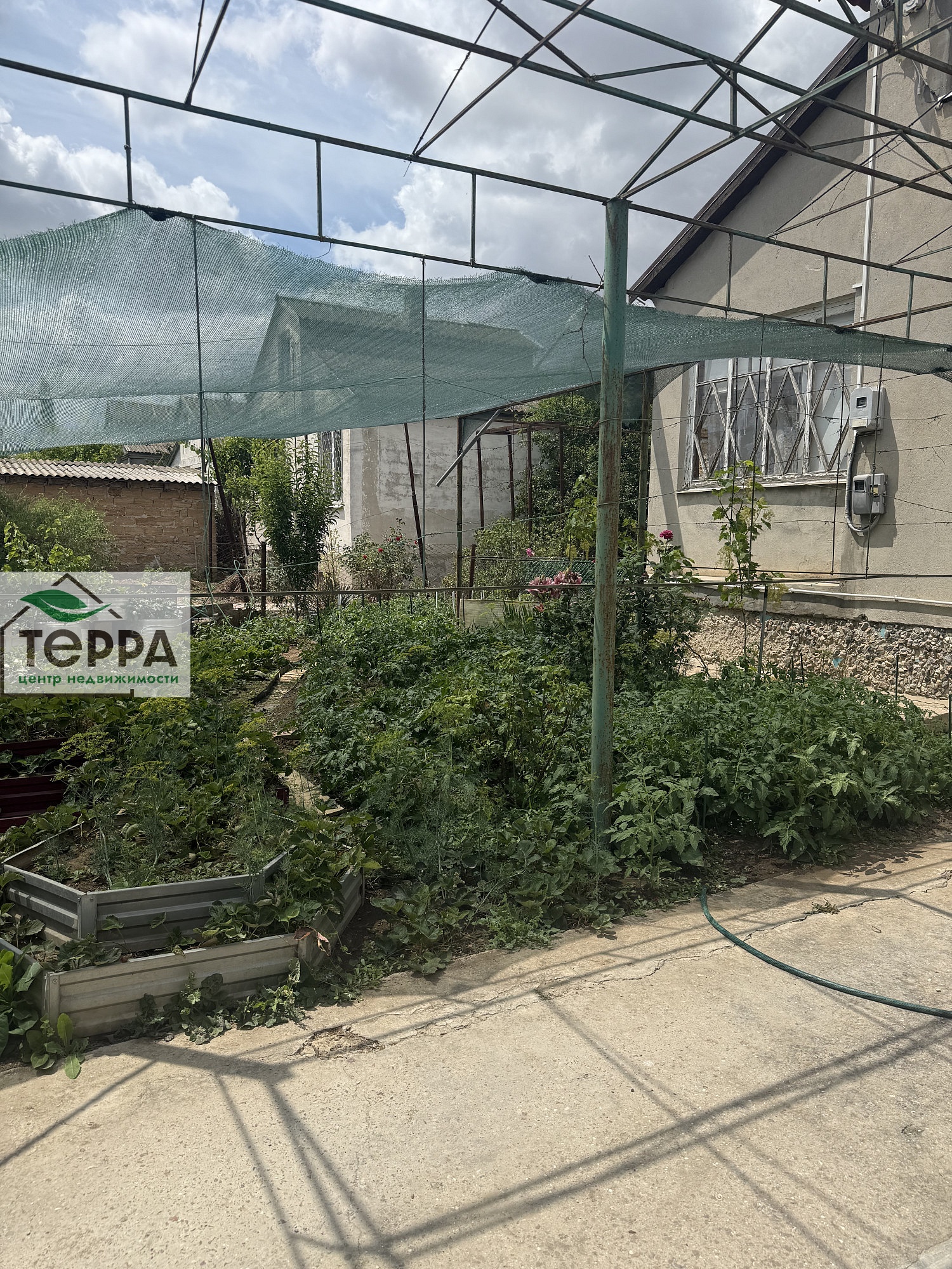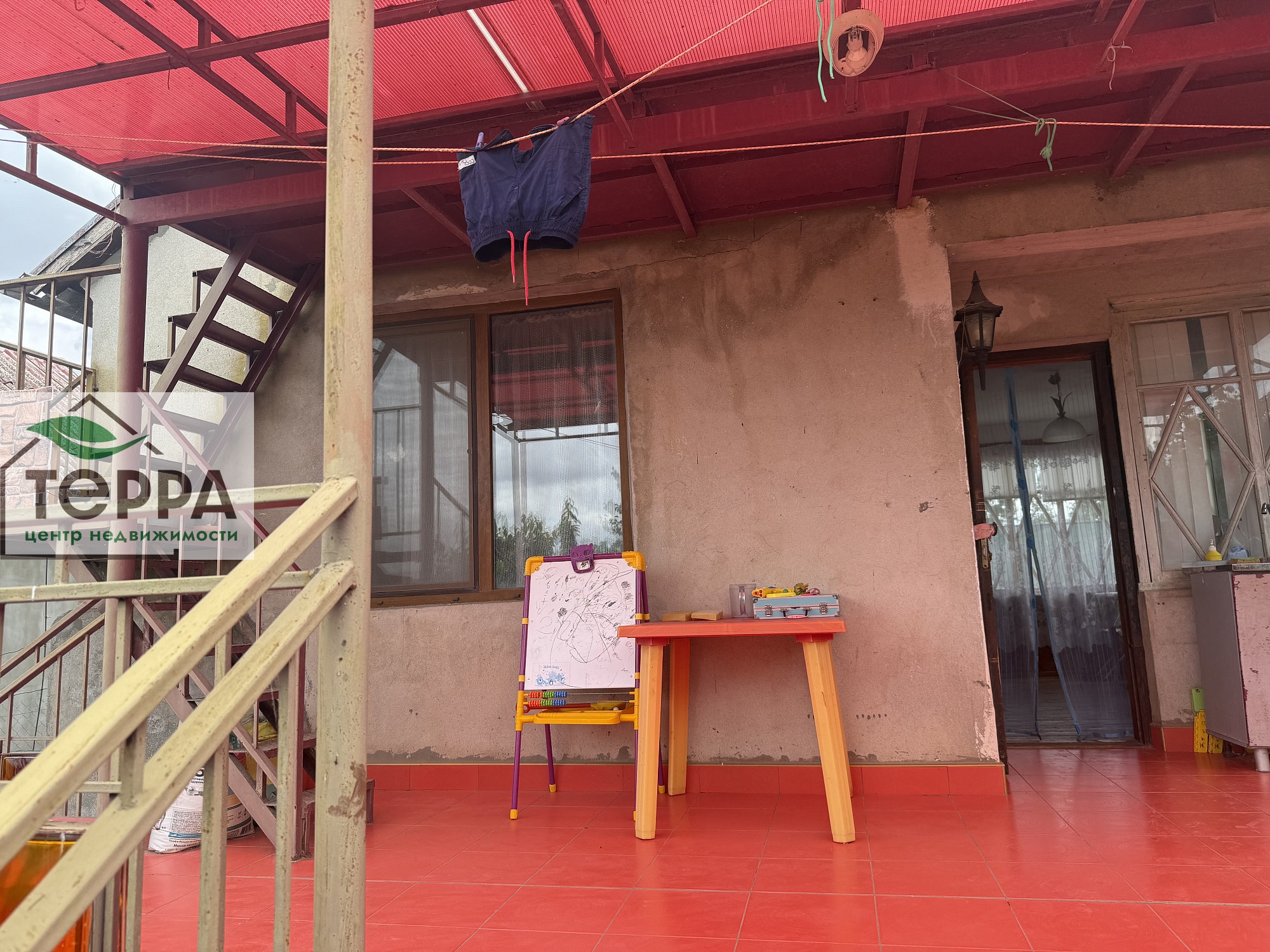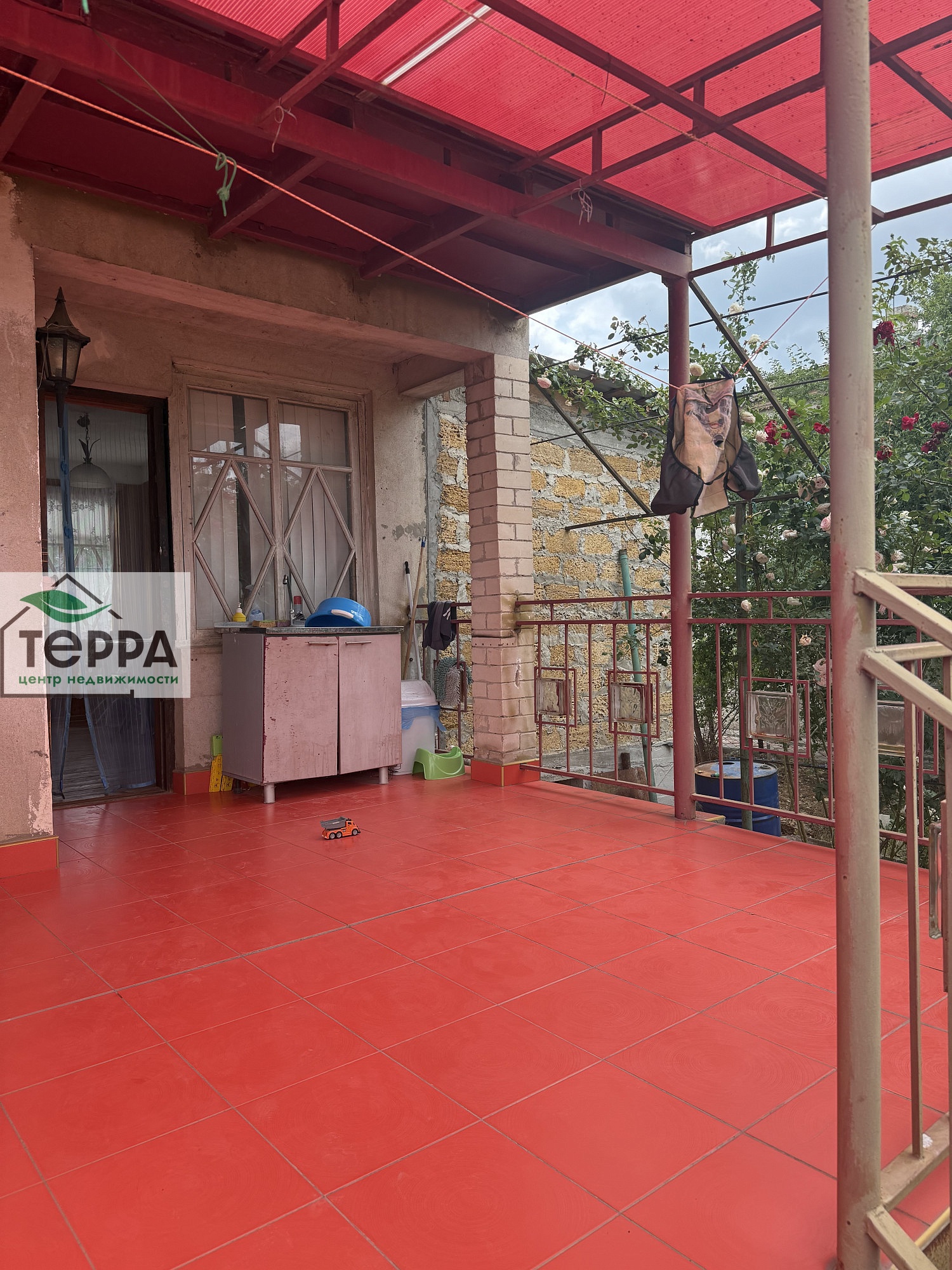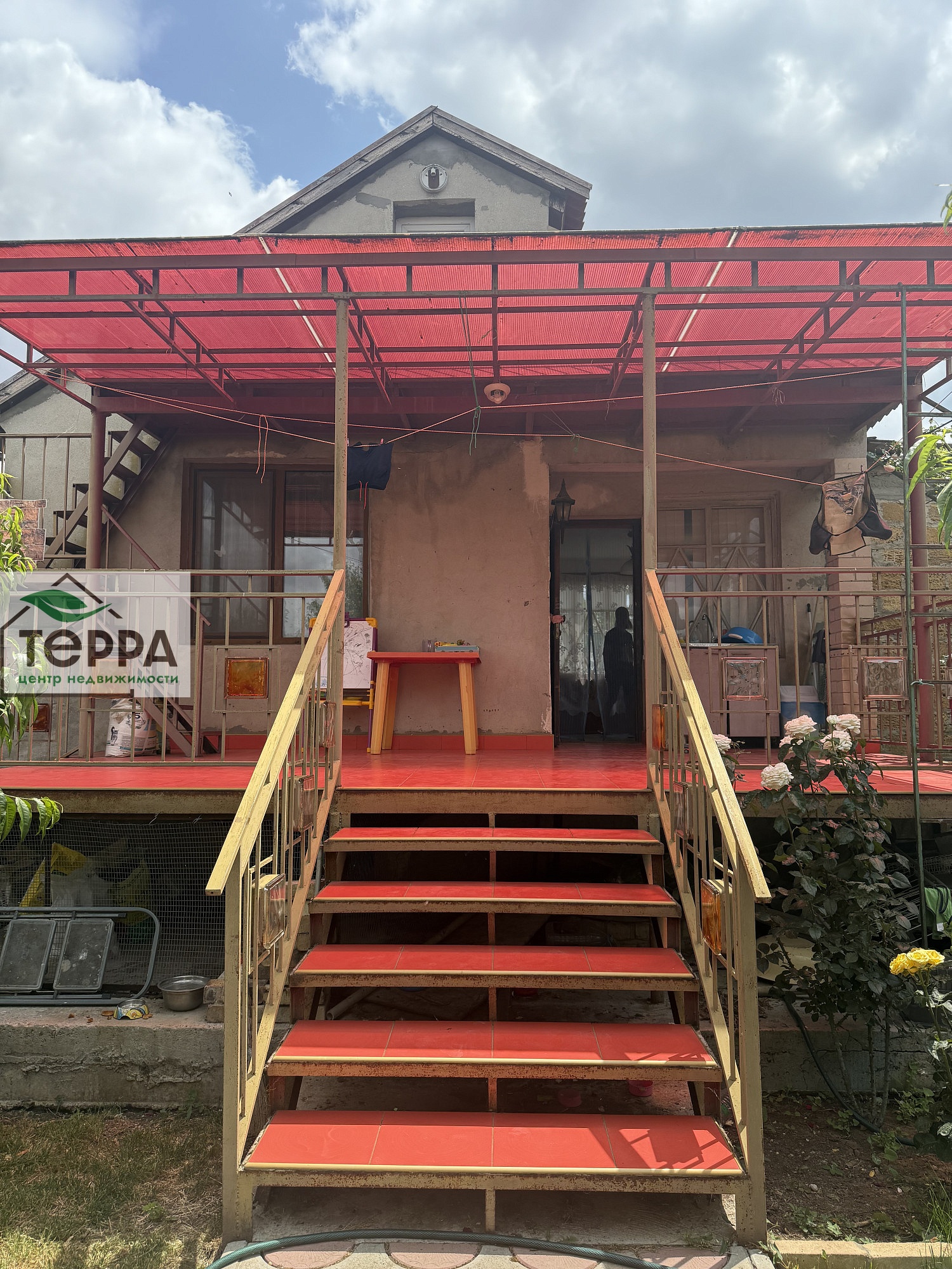 Перед домом терраса с навесом.