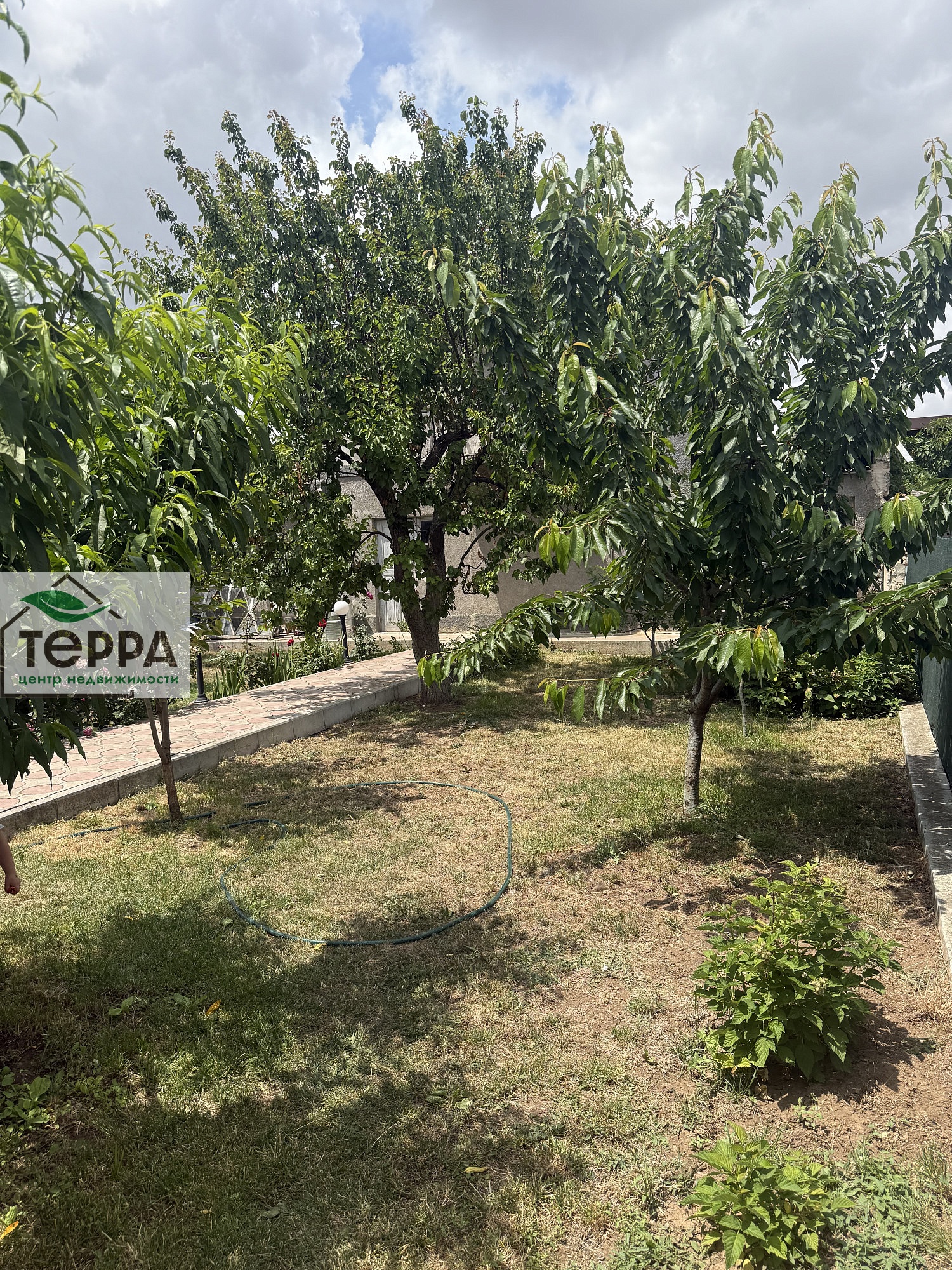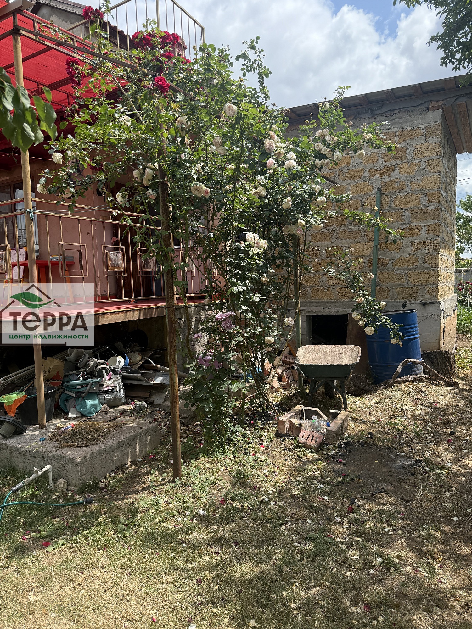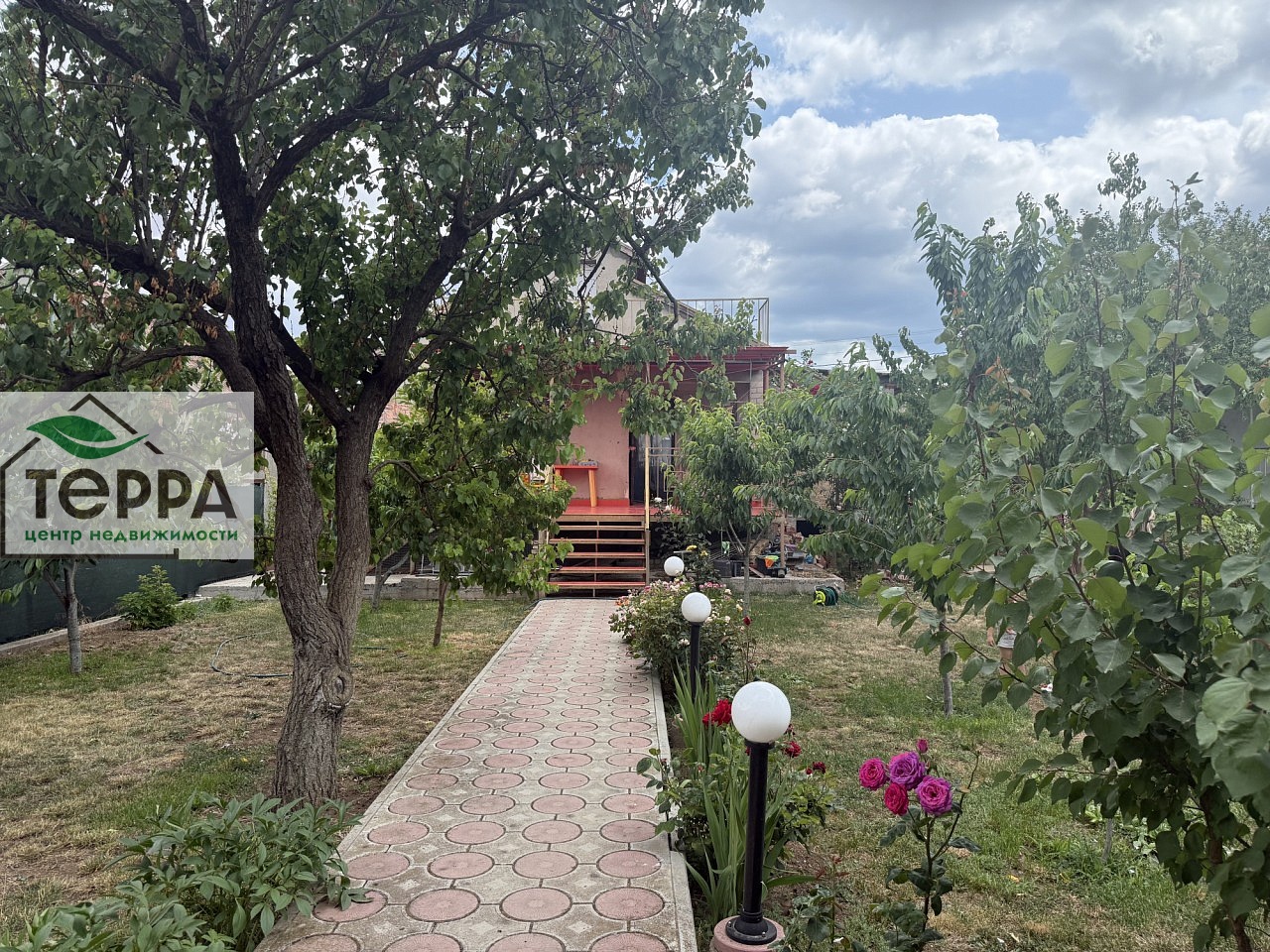 Фруктовый сад, виноград, много кустов роз, участок ухоженный, не запущенный.