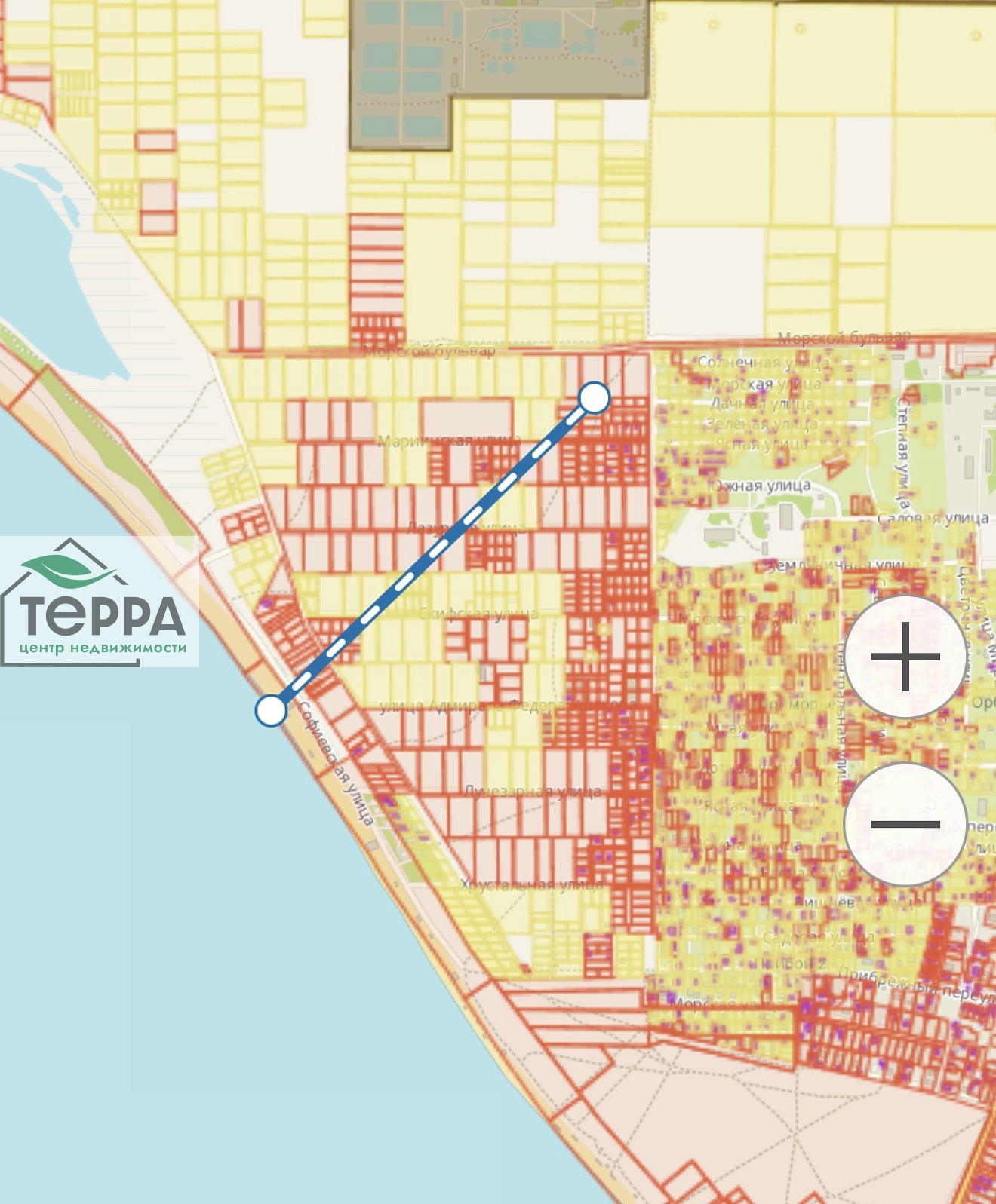 от линии моря. Рядом располагаются уже отстроенные строения соседей.